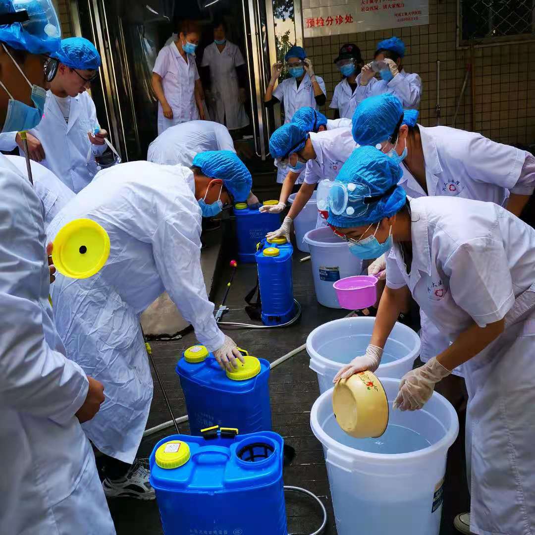 7月25日,突然接到学校和机关党委开展校园消杀工作通知后,校医院闻令而动,组织防疫人员迅速集合到位,搬出电动喷雾器40台,拆封、组装、调试、配药,在机关突击队员的帮助下,迅速将40台喷雾器装满消毒液。突击队员们身穿白大衣、佩戴口罩、帽子、护目镜,全副武装,背上药桶开始对校园全方位的卫生防疫消杀工作,一直干到下午1点多钟。7月26日、27日、28日,再次对校园公共区域和六号楼、4号楼地下室进行了全面消杀。在消杀工作中,校医院防疫人员不怕苦、不怕累,冲锋在前,圆满完成了学校前一阶段的防疫消杀工作。截止7月28日,校医院投入消毒消杀应急人员51人次,累计使用84消毒液10万多毫升。