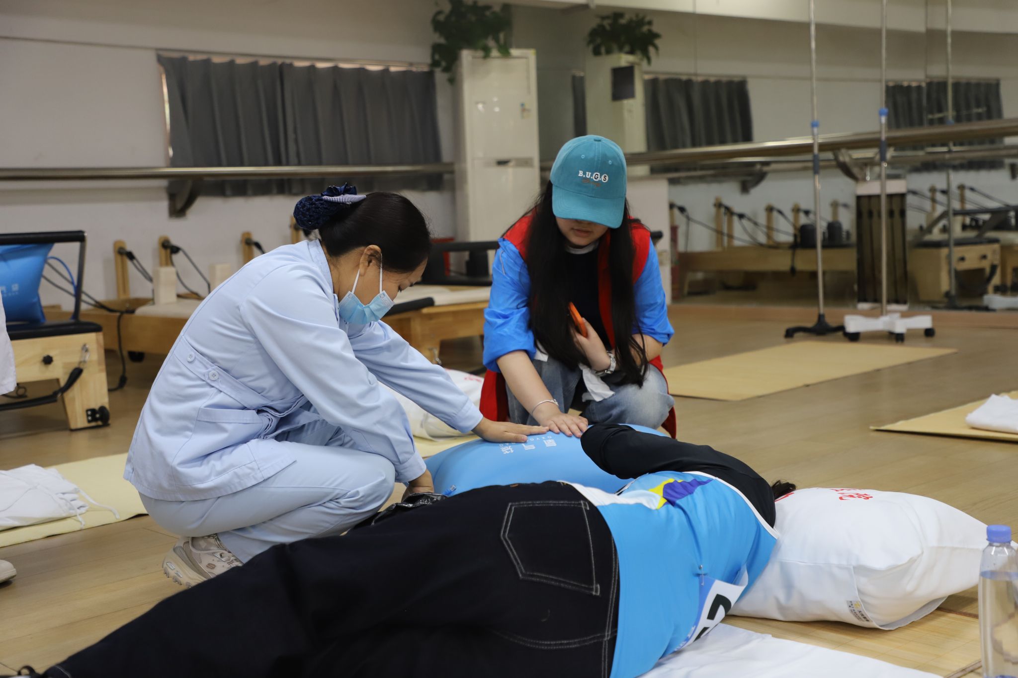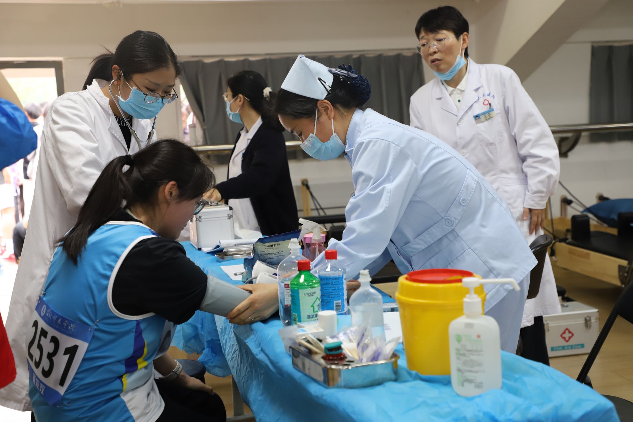 运动会筹备阶段,校医院结合田径赛事高强度、高风险的特点,制定了详细的医疗保障工作方案,明确了保障流程、责任分工和应急处置预案。结合以往常见损伤类型,提前备足急救药品、器械和防护用品,包括急救药品、外伤处置药物、担架、冰袋及 AED 、心电监护仪等,确保应急物资足额到位。