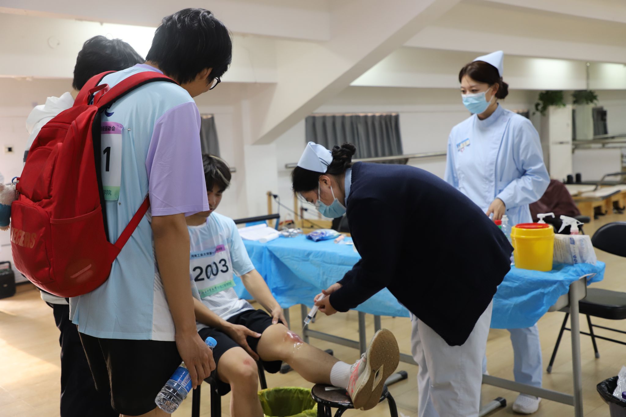 运动会期间,校医院医护团队坚守一线,及时巡查赛事动态。对擦伤、扭伤、肌肉拉伤等运动损伤及时规范处理;对头晕、乏力、胸闷、腹痛呕吐等症状,及时予以吸氧、补液、对症等综合干预;对中暑、低血糖等症状准确判断,给予降温、静滴葡萄糖等;对可疑韧带损伤、骨折等及时转出并交代注意事项,展现出扎实的急救应变能力。全程做到快速响应、规范处置、及时安抚。全体医护人员专业高效、全情投入、协同合作,用责任与担当为赛事安全保驾护航。